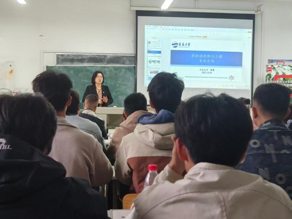 活动伊始,周蓉老师从多角度对专业进行了系统解读。首先,她概述了非织造材料与工程专业的核心定位,强调其在现代纺织、医疗防护及环保科技等领域的广泛应用前景;其次,介绍了专业教师团队的组成,包括资深教授和青年骨干教师的专业背景与研究专长;最后,聚焦学生就业,周老师结合实际案例分析了毕业生的就业去向,涵盖知名企业、科研机构及深造路径,鼓励新生树立职业目标。对于新生尽快构建完整的专业认知框架有很大帮助。
